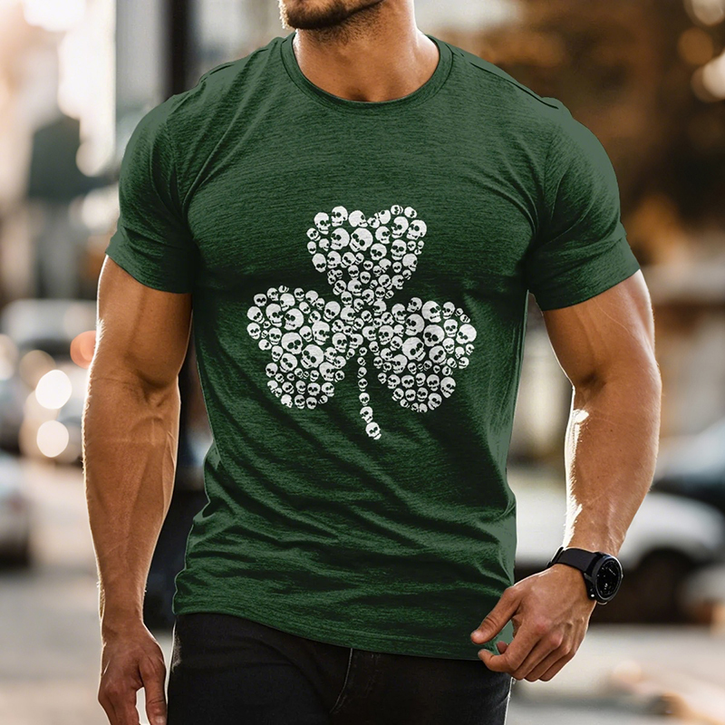 Men's St. Patrick's Day Skull And Clover Pattern Comfortable Crew Neck T-shirt