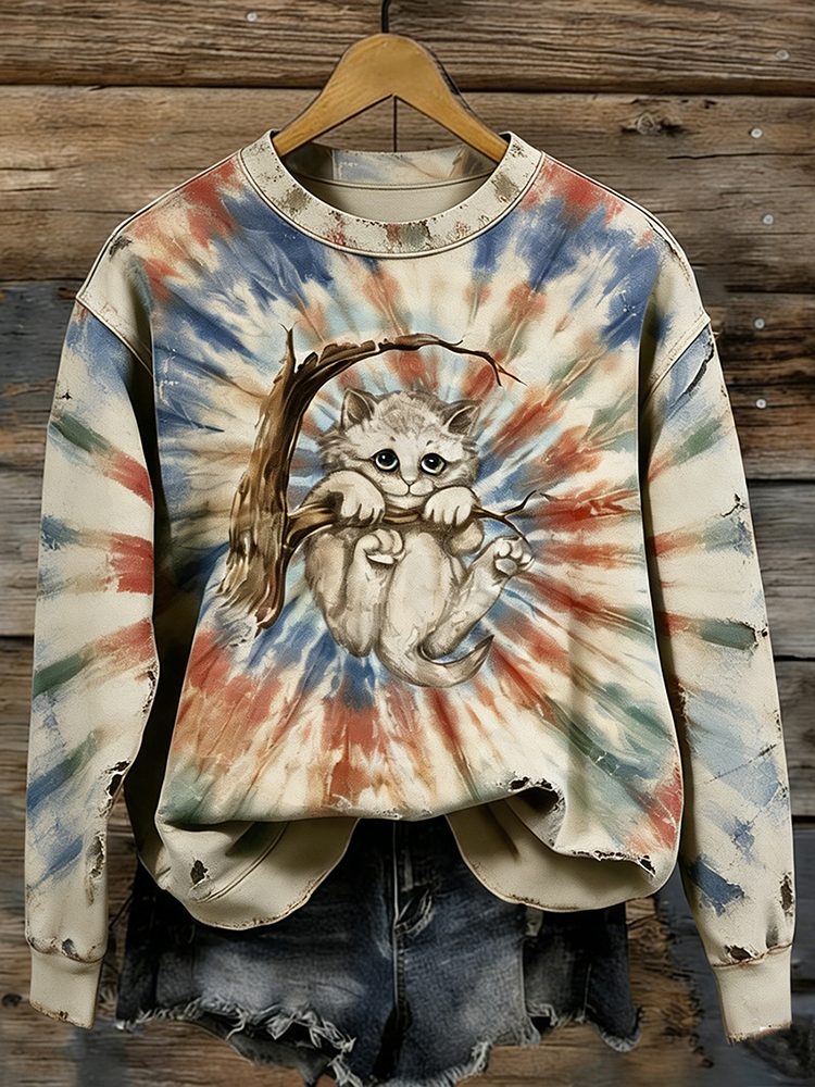 Opalite Kitten In Tree Vintage 90s Distressed Cat With Tie Dye Art Cozy Sweatshirt