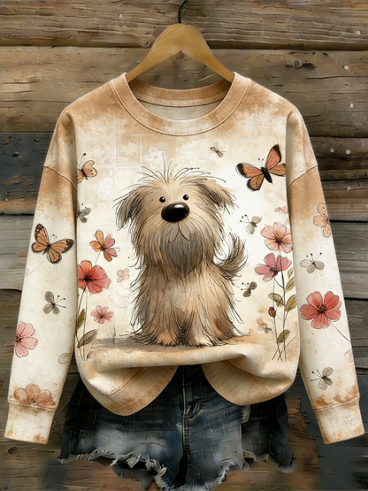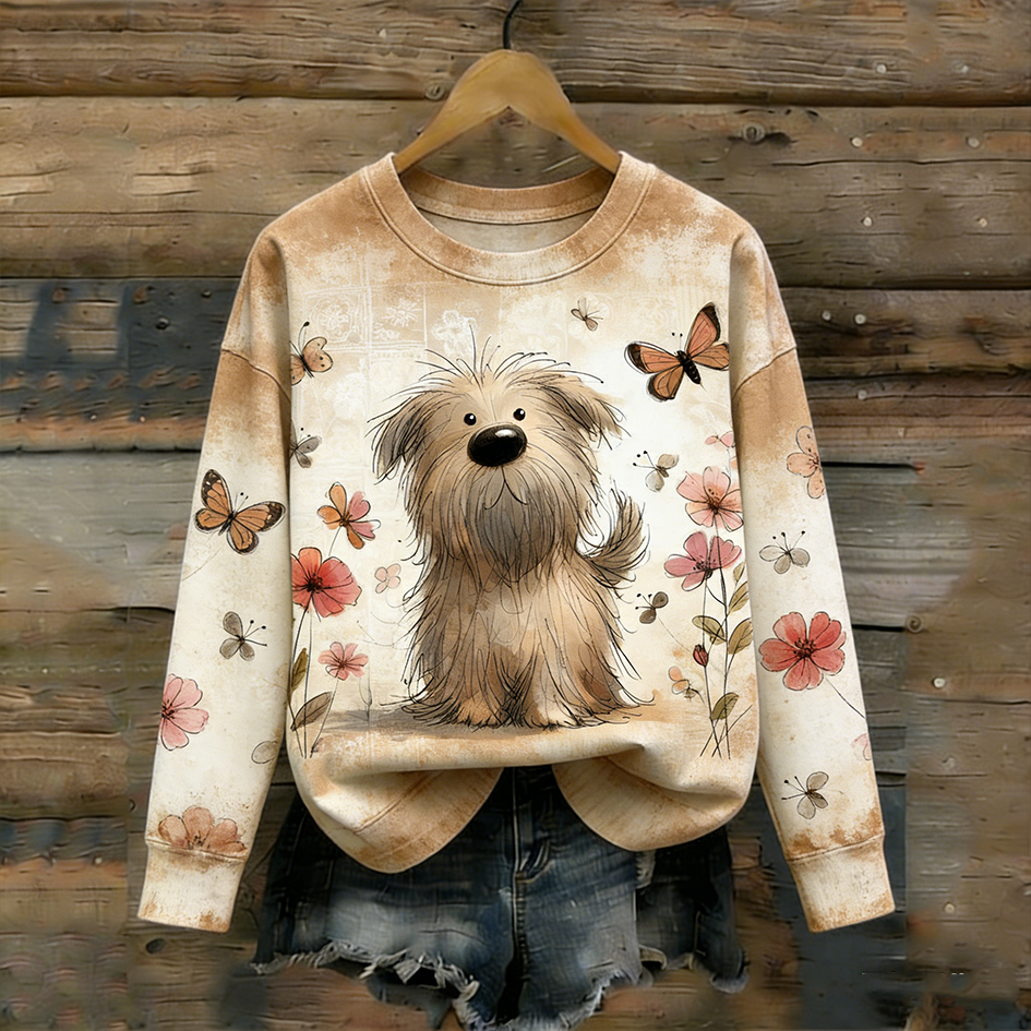 Retro Line Art Cute Animal Print Casual Long-sleeve T-shirt