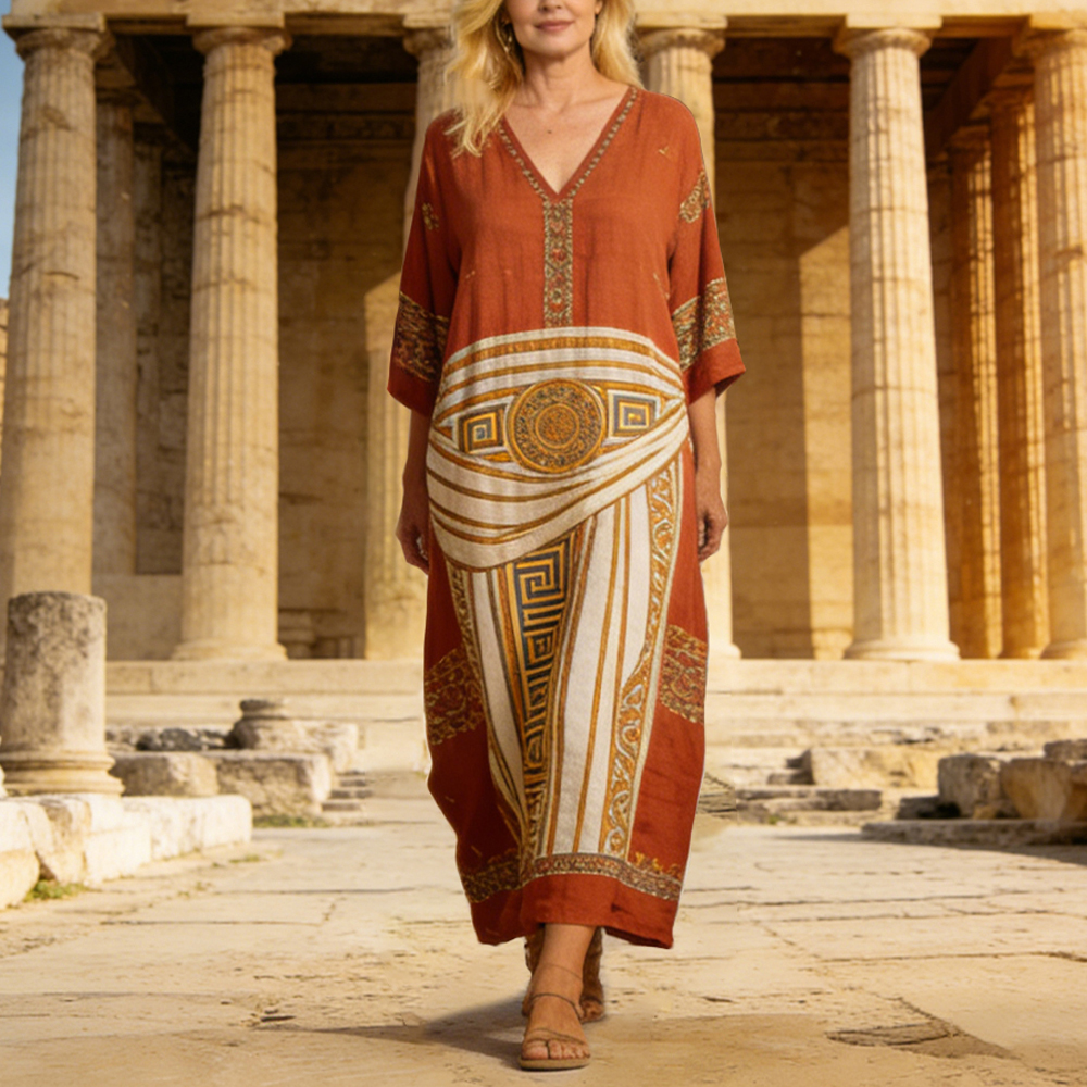 Vintage Greek Pattern Women's Linen V-neck Maxi Dress