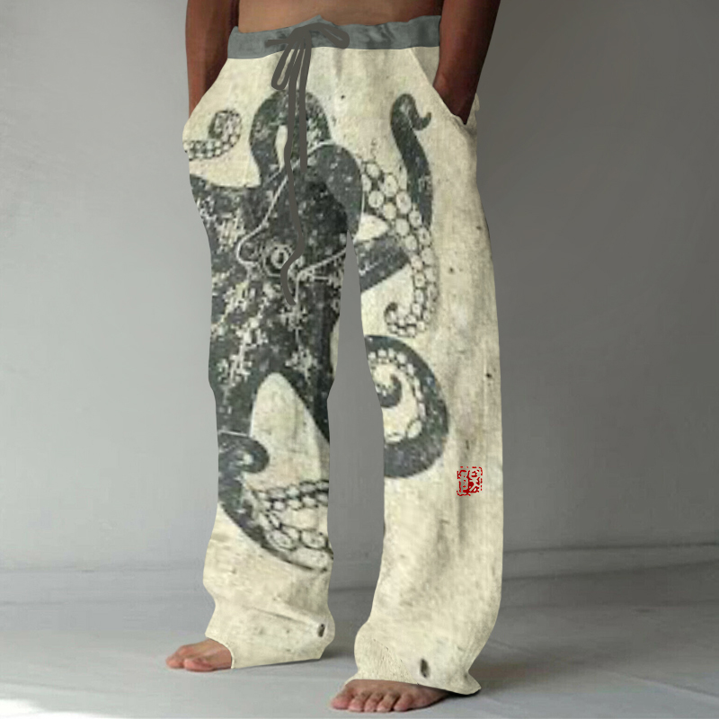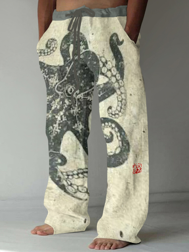 Vintage Japanese Art Octopus Print Casual Linen Blend Pants
