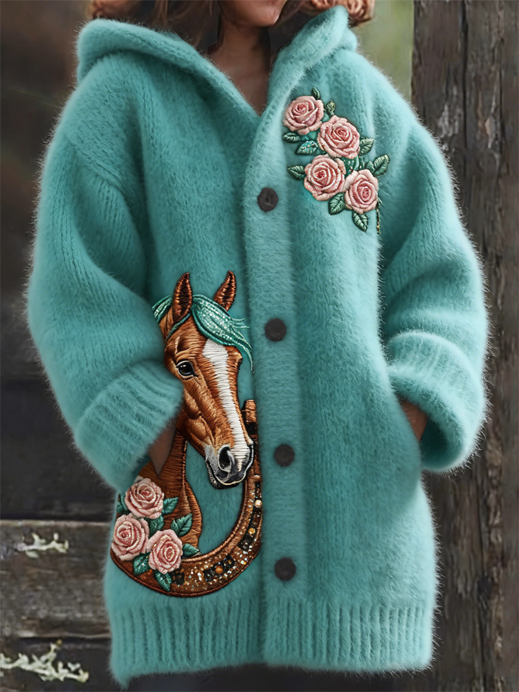 Western Horse & Horseshoe Roses Glitter Embroidered Hooded Cardigan