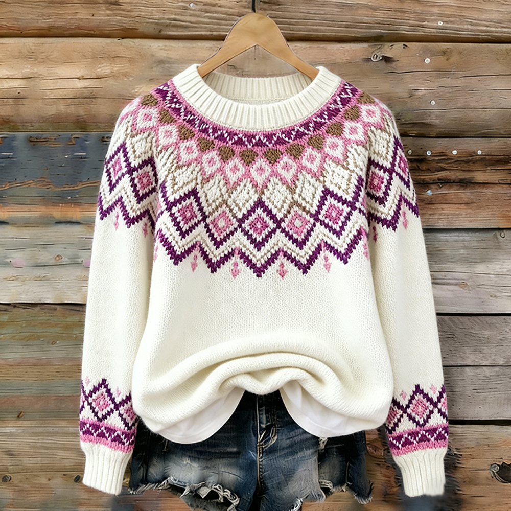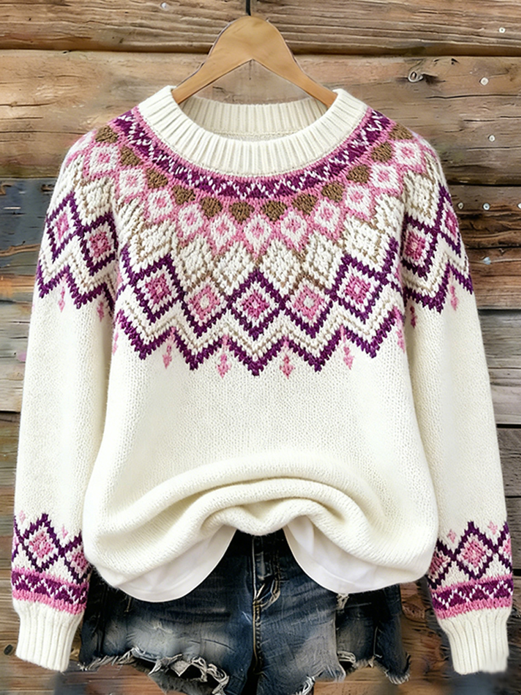 Women's Fair Isle Patterned Pink Motif Crew Neck Sweater