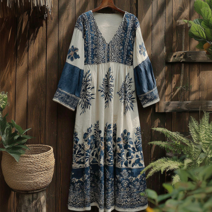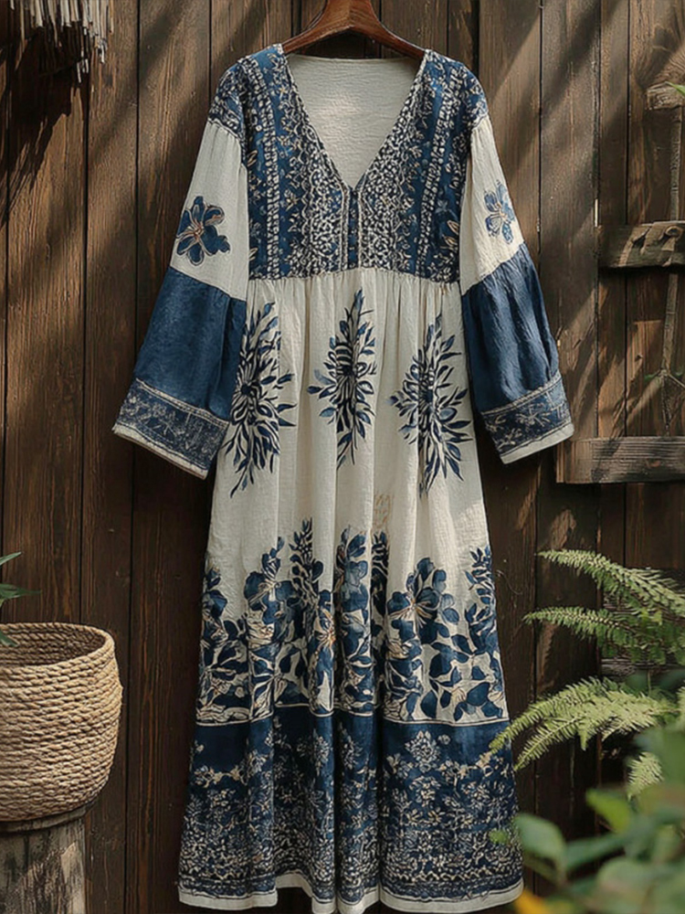 Women's Floral V-neck Long-sleeved Dress
