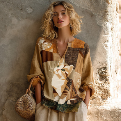 Women's Retro Cute Cat With Patchwork Art Print Comfy Top