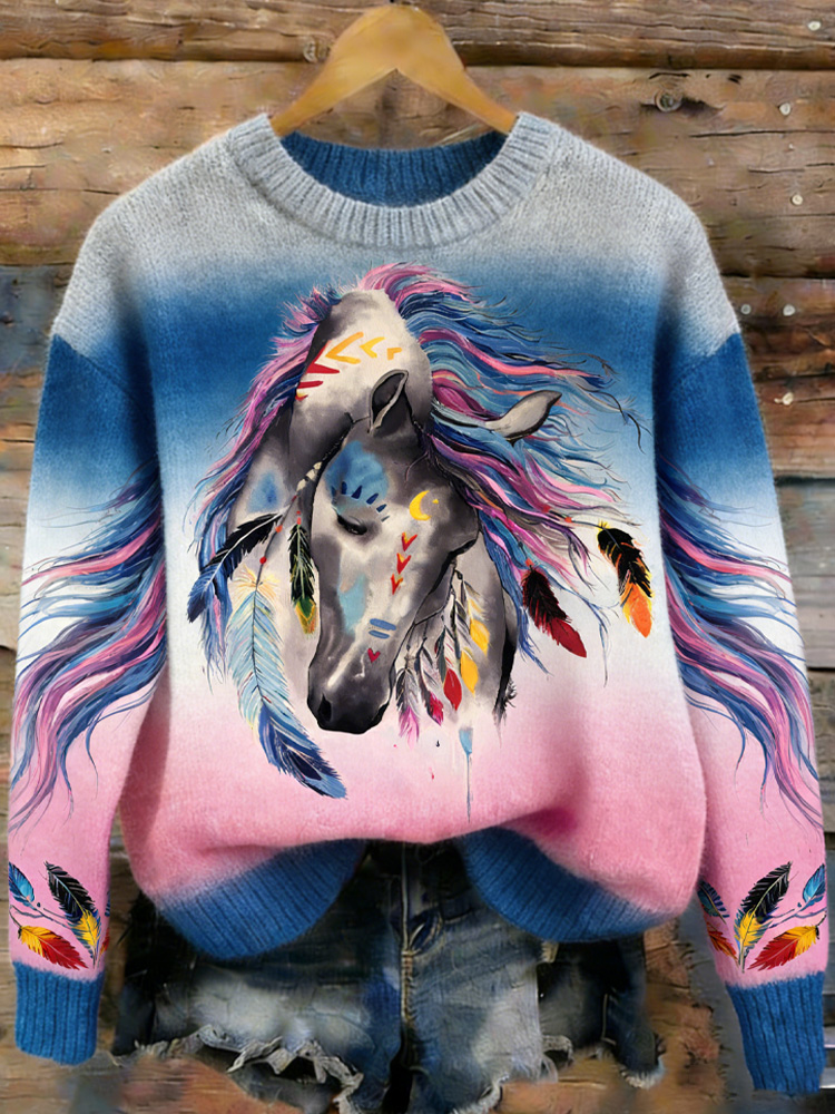 Women's Retro Horse Art Embroidery Print Sweater